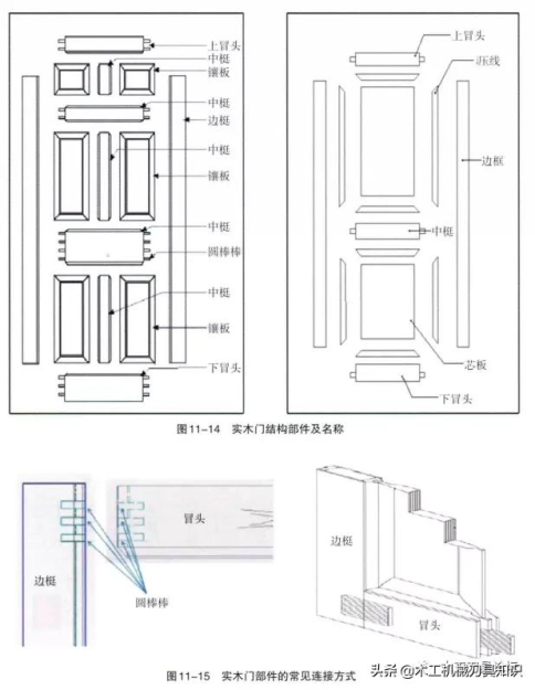 實木門全面構造并且常見的部件連通方法見圖11-14,圖11一15所示。