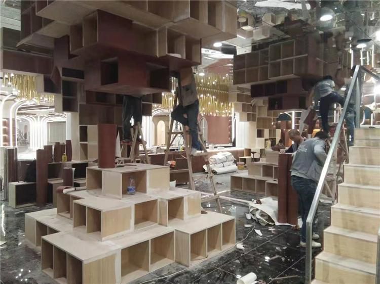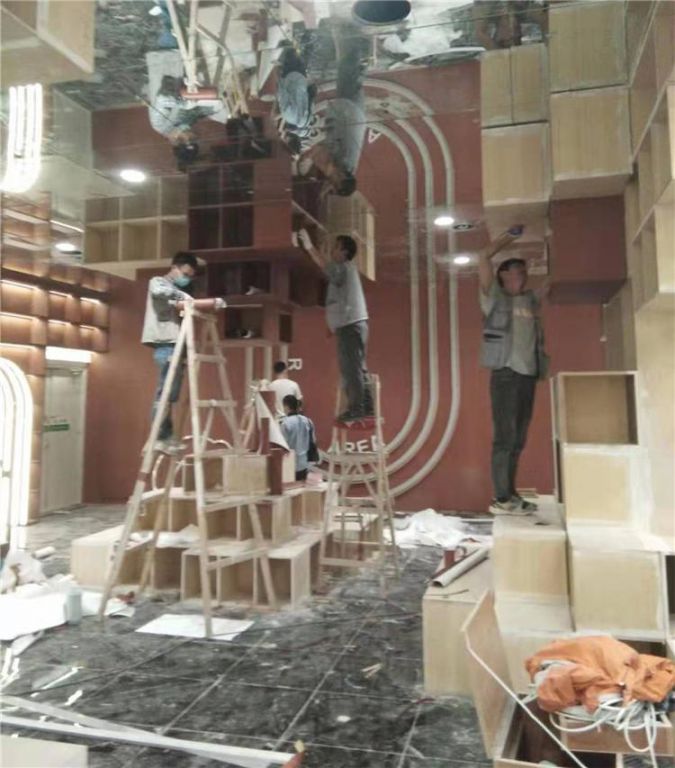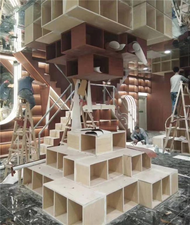 做這種造型設(shè)計(jì)最重要的就是一定要將邊角的部分壓實(shí),否則空氣進(jìn)入導(dǎo)致空鼓或者木紋膜脫落都會(huì)影響建筑整體的美觀性,所以前期的準(zhǔn)備工作也是很重要的。