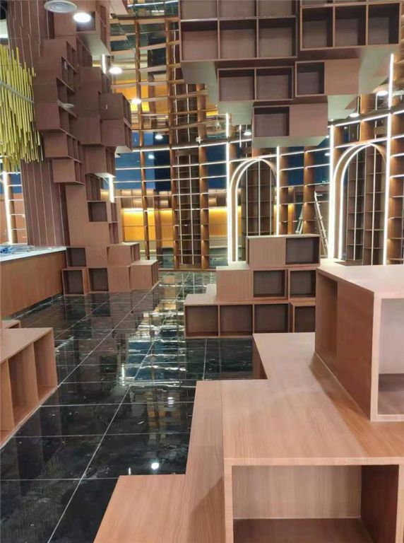 書店、展廳、店鋪如果要做出這種多格子的建筑設(shè)計(jì),最能體現(xiàn)環(huán)境氛圍的就是用木紋紙覆蓋建筑表面,達(dá)到色彩統(tǒng)一、質(zhì)感高級(jí)的視覺效果。
