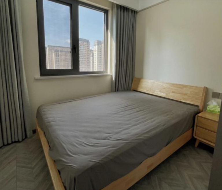 次臥空間不大,一張原木1.5米的床加上一個床頭柜和衣柜,基本沒有什么多余的空間了。對于臥室來說,非常常見了。地面鋪貼的木地板,顯得很有檔次,效果真心不錯。沒有瓷磚那種冷冰冰的感覺,更舒服。