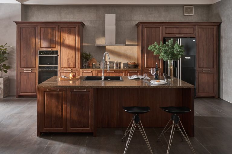 深色木紋的天然實木廚柜適用于明亮的廚房。無論風格是現(xiàn)代還是經典,深色木質廚房都是永恒的選擇,將為您的廚房帶來一定的優(yōu)雅。深色廚柜看起來時尚、神秘和高檔。