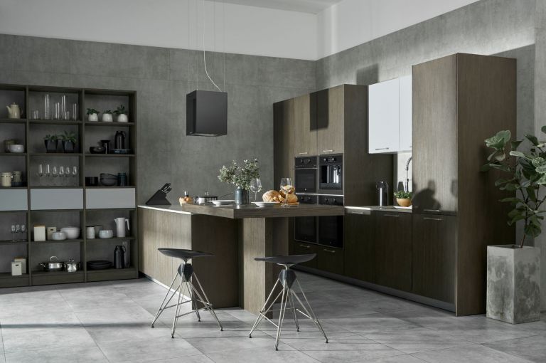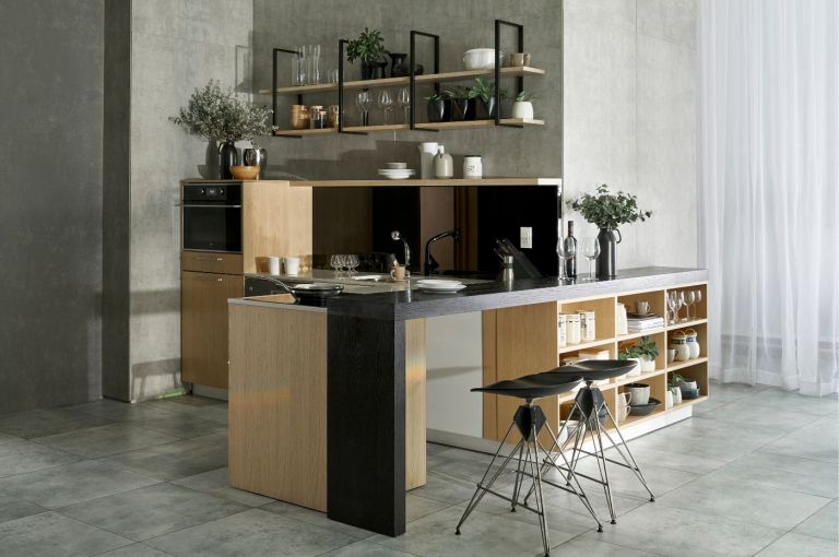 灰色天然木廚柜搭配獨特的木紋線條,為室內裝飾帶來時尚時尚的美感。與石材、同色混凝土、綠樹等原材料相結合,為廚房空間營造出詩意的靜謐效果。