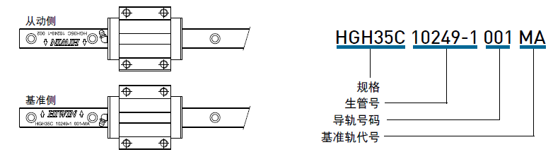 當非互換型直線導軌配對使用時,需注意基準軌與從動軌之差異?;鶞受墏冗吇鶞拭婢容^從動軌高,可作為床臺安裝承靠面。基準軌上有刻上MA之記號,如圖所示。