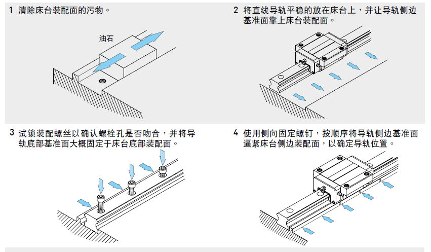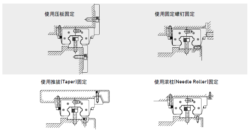 當床臺受到振動、沖擊力的作用時,導軌及滑塊很可能偏離原來的固定位置,而影響精度。為避免發生類似的狀況,建議使用下圖所列的四種固定方式固定導軌及滑塊,以確保機臺的運行精度。