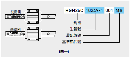 2. 確認基準軌與從動軌:當非互換型直線導軌配對使用時,需注意基準軌與從動軌之差異。基準軌側邊基準面精度較從動軌高,可作為床臺安裝承靠面。基準軌上有刻上MA之記號。而且,雙軌配對使用時,基準軌編號為奇數,而從動軌之導軌編號為偶數,安裝時請依照符號的指示,按順序進行安裝(例如:001與002配對、003與004配對…),如圖一所示。如為多軌安裝,請以此類推。