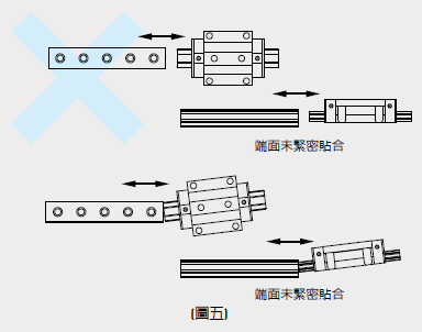 6. 安裝直線導軌時,請勿將非互換型導軌之滑塊任意對調使用,以免影響精度。