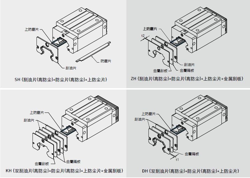 HIWIN針對較一般環(huán)境嚴苛之作業(yè)環(huán)境,開發(fā)強化高防塵功能之防塵配件,若有下列高防塵配件需求時,請于產(chǎn)品型號后面加注代碼。
