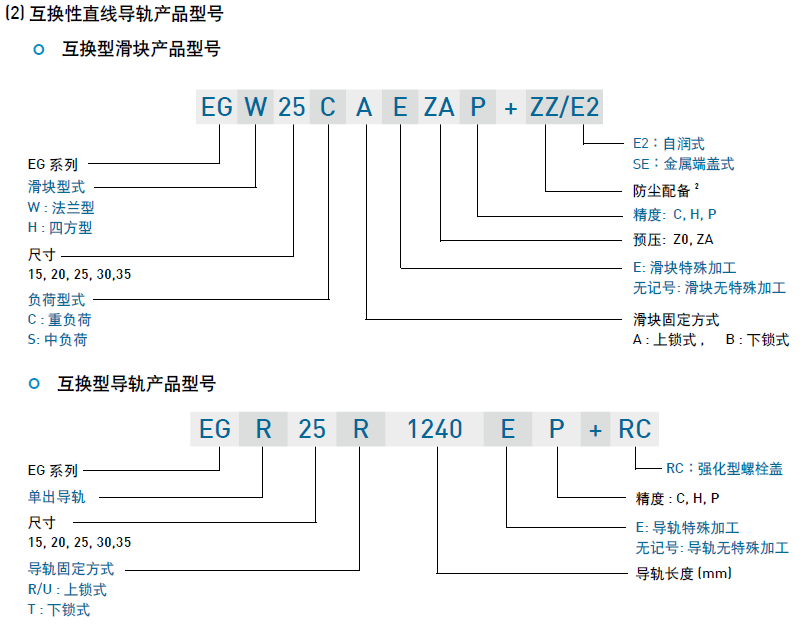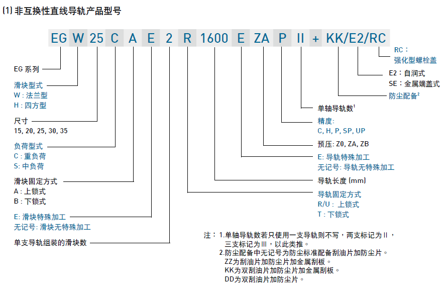 EG系列分為非互換性及互換性型兩種直線導軌,兩者規格尺寸相同,主要差異點在于互換性型之滑塊、導軌可單獨互換使用,較便利,但其組合精度無法達到非互換性型之超精密級以上的精度,不過由于HIWIN互換性型之組合精度目前已達到一定的水平,對不需配對安裝直線導軌的客戶而言,是一項便利的選擇。直線導軌的產品規格型號主要標明直線導軌尺寸、型式、精度等級、預壓等規格要求,以利訂貨時雙方對產品的確認。