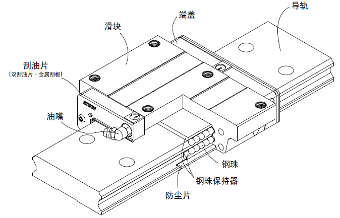 ? 滾動(dòng)循環(huán)系統(tǒng):滑塊、導(dǎo)軌、端蓋、鋼珠、鋼珠保持器。