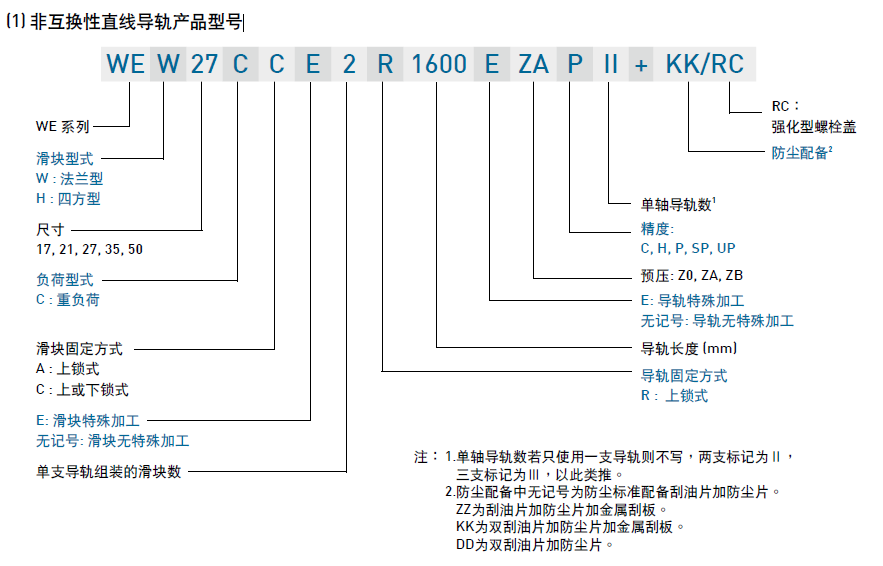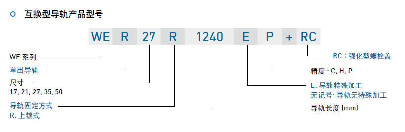 WE系列分為非互換性及互換性型兩種直線導(dǎo)軌,兩者規(guī)格尺寸相同,主要差異點(diǎn)在于互換性型之滑塊、導(dǎo)軌可單獨(dú)互換使用,較便利,但其組合精度無(wú)法達(dá)到非互換性型之超精密級(jí)以上的精度,不過(guò)由于HIWIN互換性型之組合精度目前已達(dá)到一定的水平,對(duì)不需配對(duì)安裝直線導(dǎo)軌的客戶而言,是一項(xiàng)便利的選擇。直線導(dǎo)軌的產(chǎn)品規(guī)格型號(hào)主要標(biāo)明直線導(dǎo)軌尺寸、型式、精度等級(jí)、預(yù)壓等規(guī)格要求,以利訂貨時(shí)雙方對(duì)產(chǎn)品的確認(rèn)。